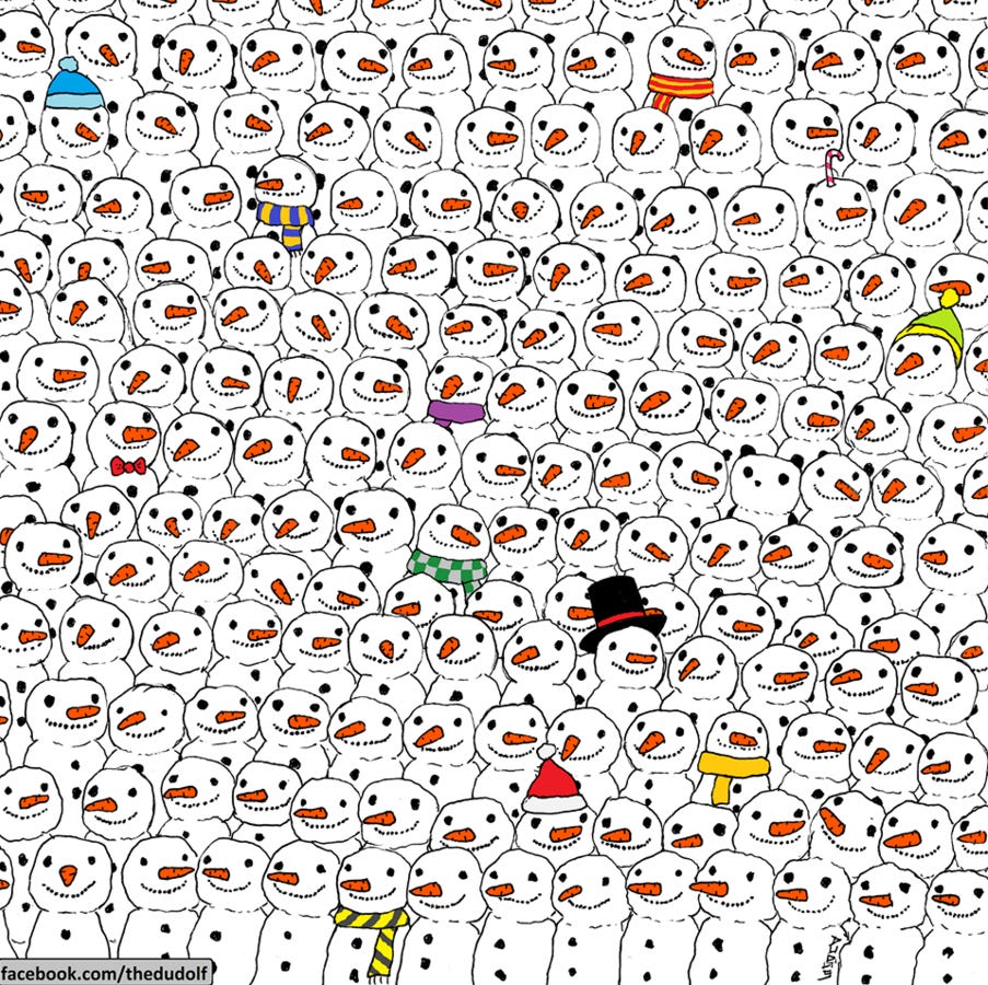 Couldn't find the panda? Locate the snowman with a checkered green scarf, move four figures to the right and look at one row above.